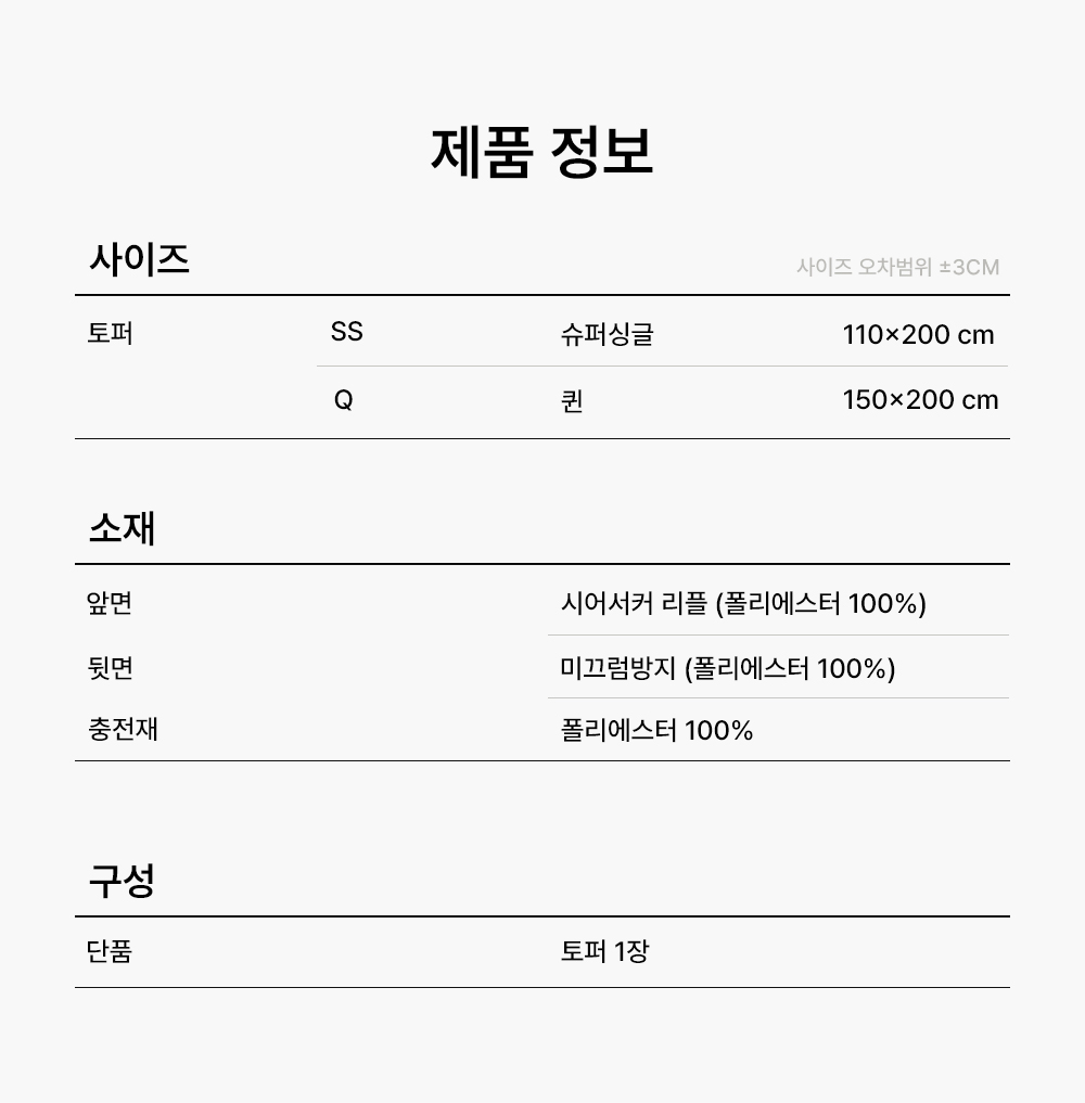 슈퍼싱글침대 사이즈에 잘맞아요 디자인이랑 색상도 깔끔합니다 아이가 써서 그런지 퀸사이즈토퍼보다 더 밀리는편이네요