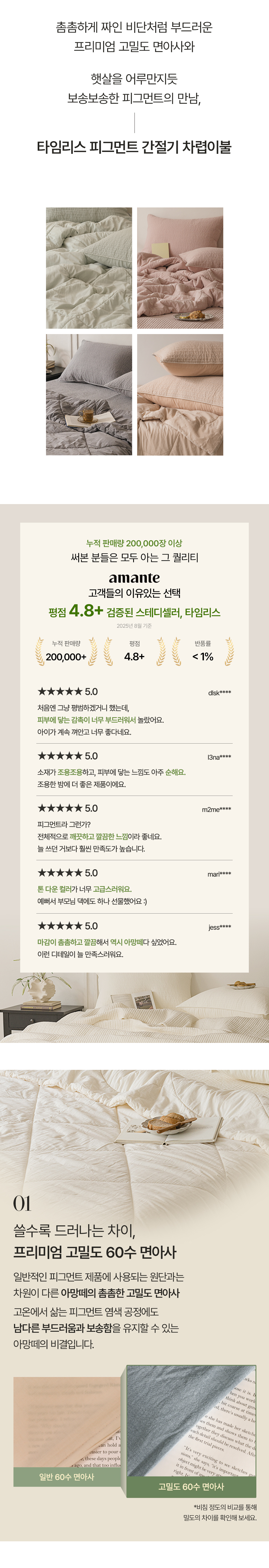 알러지케어 차렵이불 겨울에 잘 덮다가 요즘 부쩍 더워져서 간절기 이불로 구입하게 됐어요 안방침대는 소프트핑크, 아들침대에는 민트색 침구를 깔았는데 역시 포근한 피그먼트 특유의 빛깔과 빈팆ㄱ한 느낌이 너무 좋고 색감도 부드럽고 톤다운된 색이 너무 맘에 들어요 무엇보다 아사면의 촉감이 보들보들하면서 누웠을때 포근히 감싸주는 그 느낌에 정말 기분이 좋아져요 차렵이불이지만 그다지 두껍지 않아 여름에 에어컨 틀고 잘때도 딱일듯 한데 혹여 덥다 느껴지면 패드겸용 피그먼트이불 추가구입해서 덮을까 생각중이에요 저는 추위를 좀 타서 홑겹을 잘 못덮어서 이 정도도 너무 좋아요