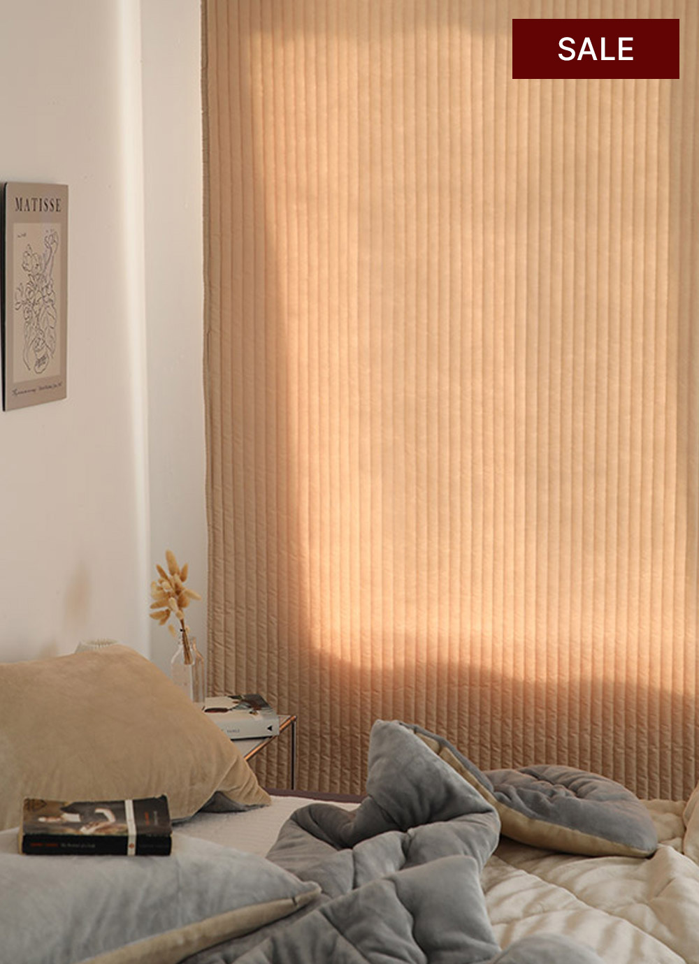 색상도 생각하던 베이지톤으로 은은하고 부담없이 조화로와요. 누빔도 깔끔하고 퀄리티가 좋으네요. 무엇보다도 확실히 하고 안하고 차이가 나게 바람도 어느정도 잘 막아주는거 같아요. 그리고 암막도 됩니다.