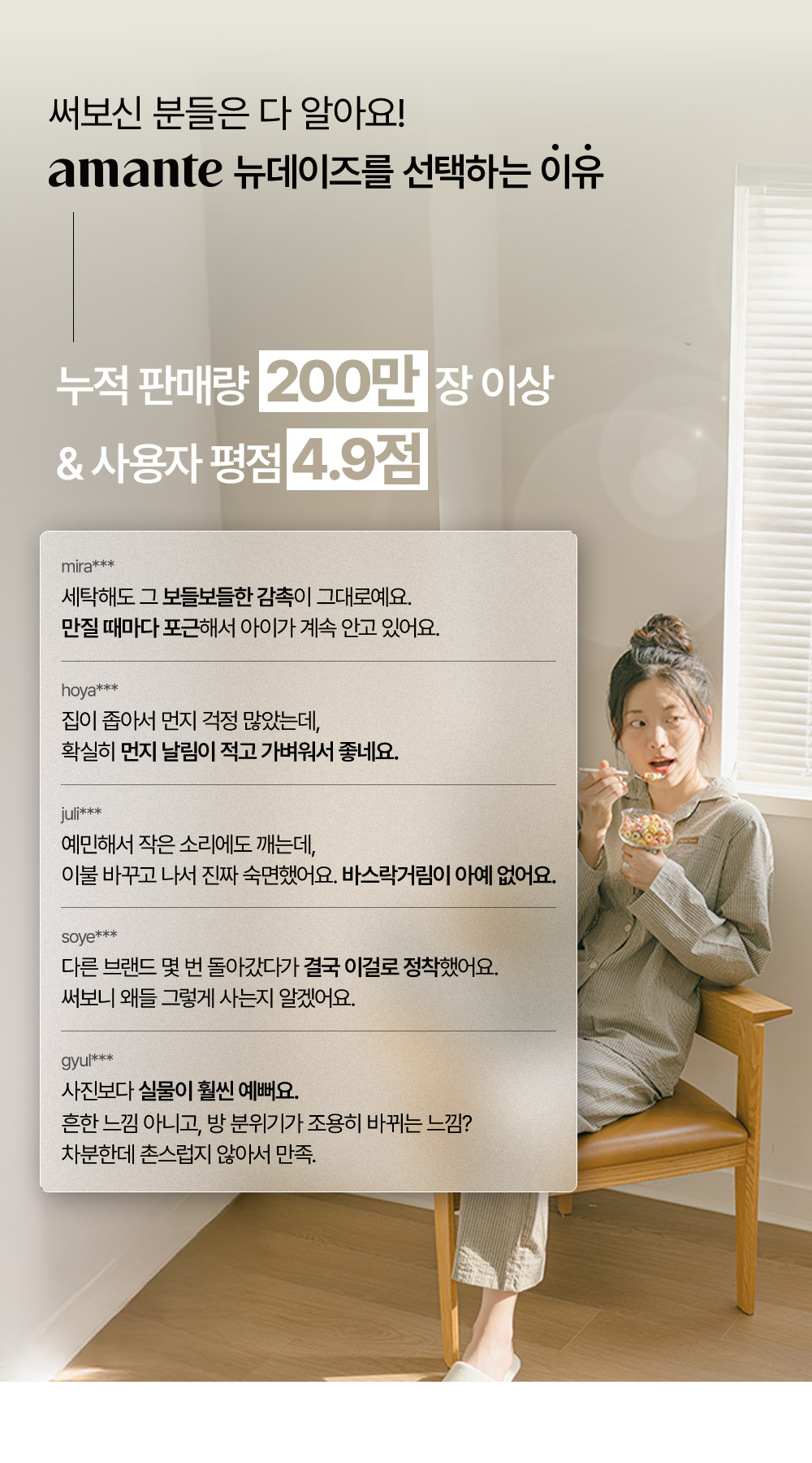 먼지도 거의 안 나고, 촉감도 부드러워서 요즘 꿀잠 자고 있어요!