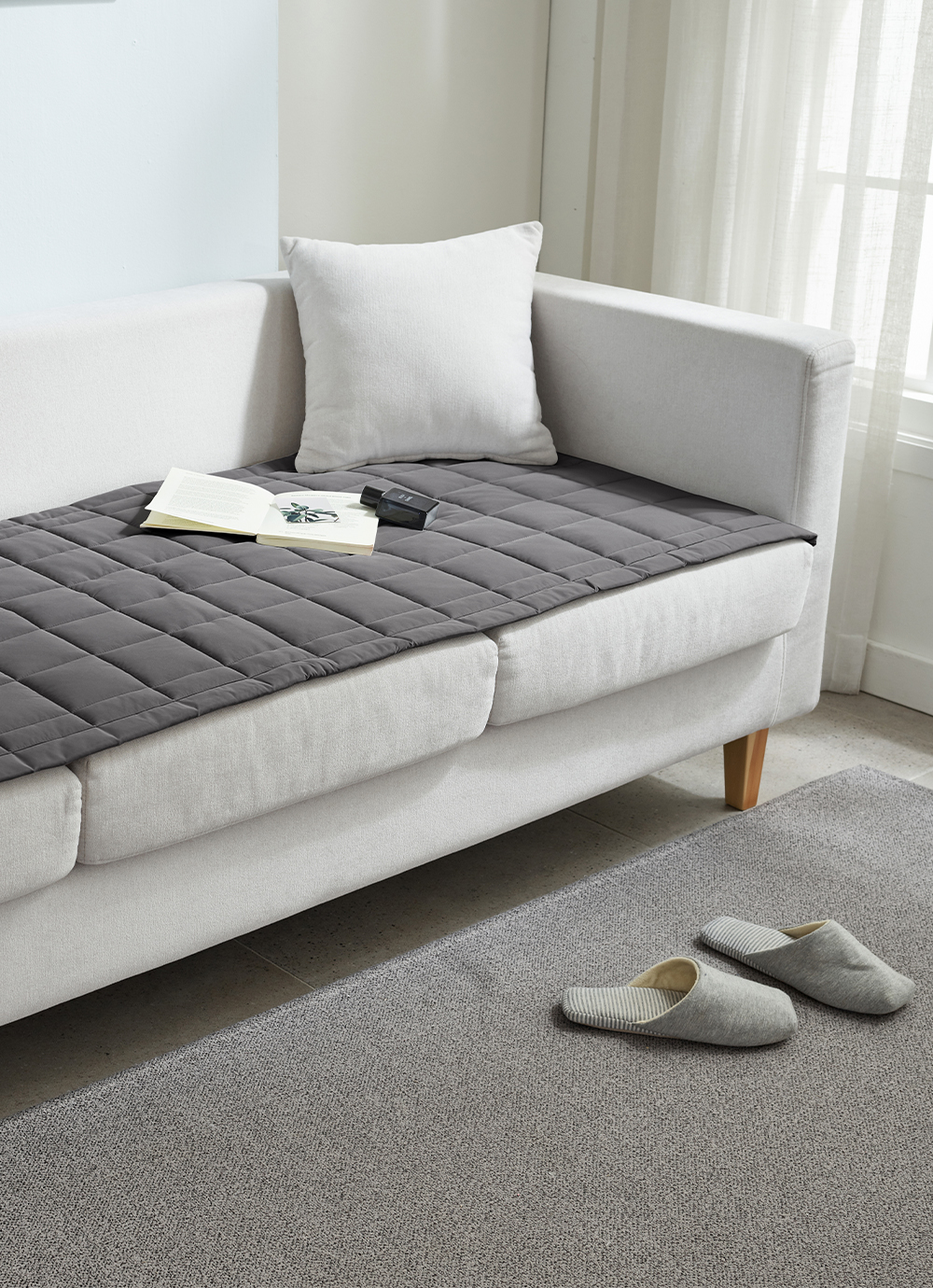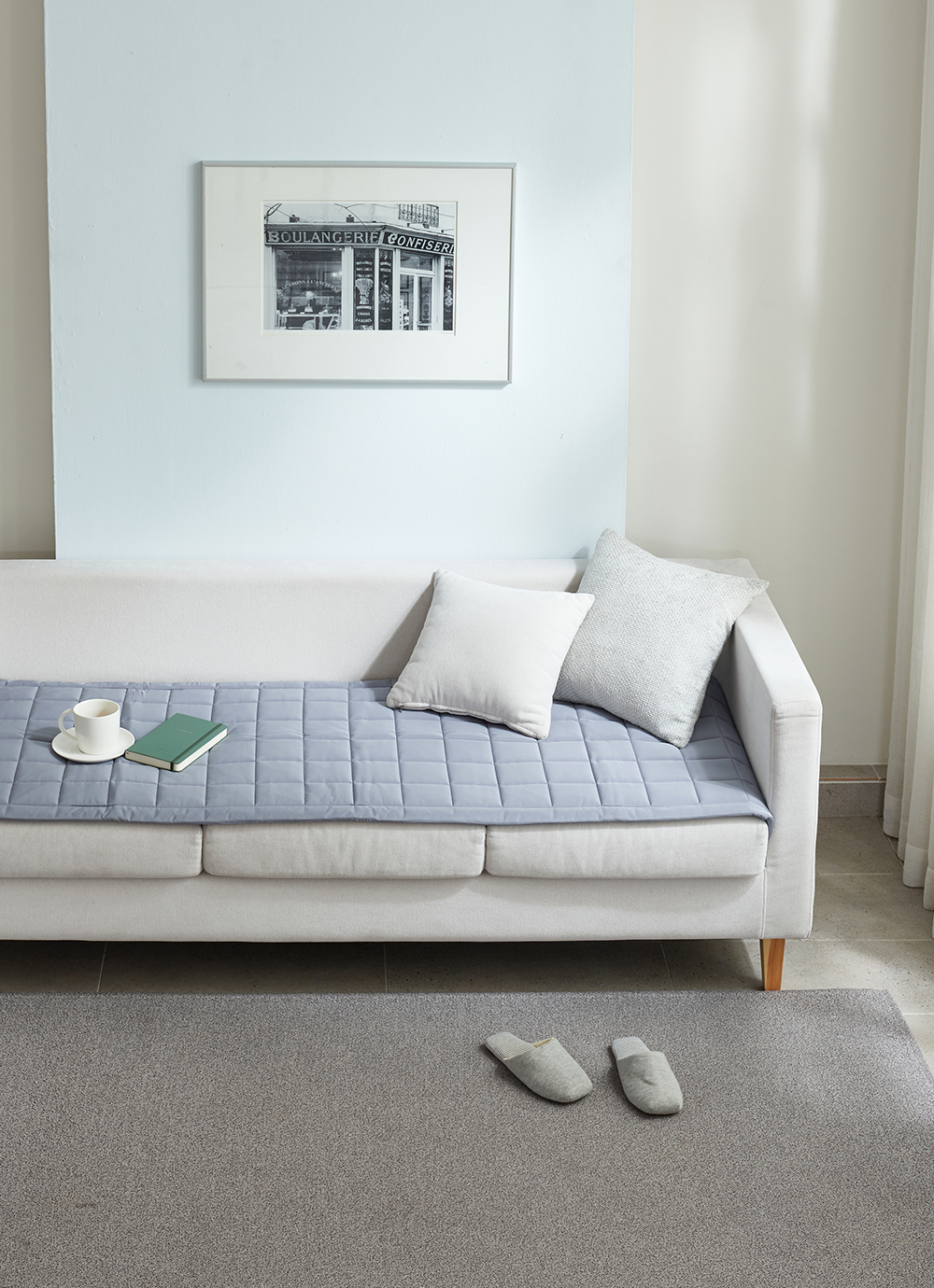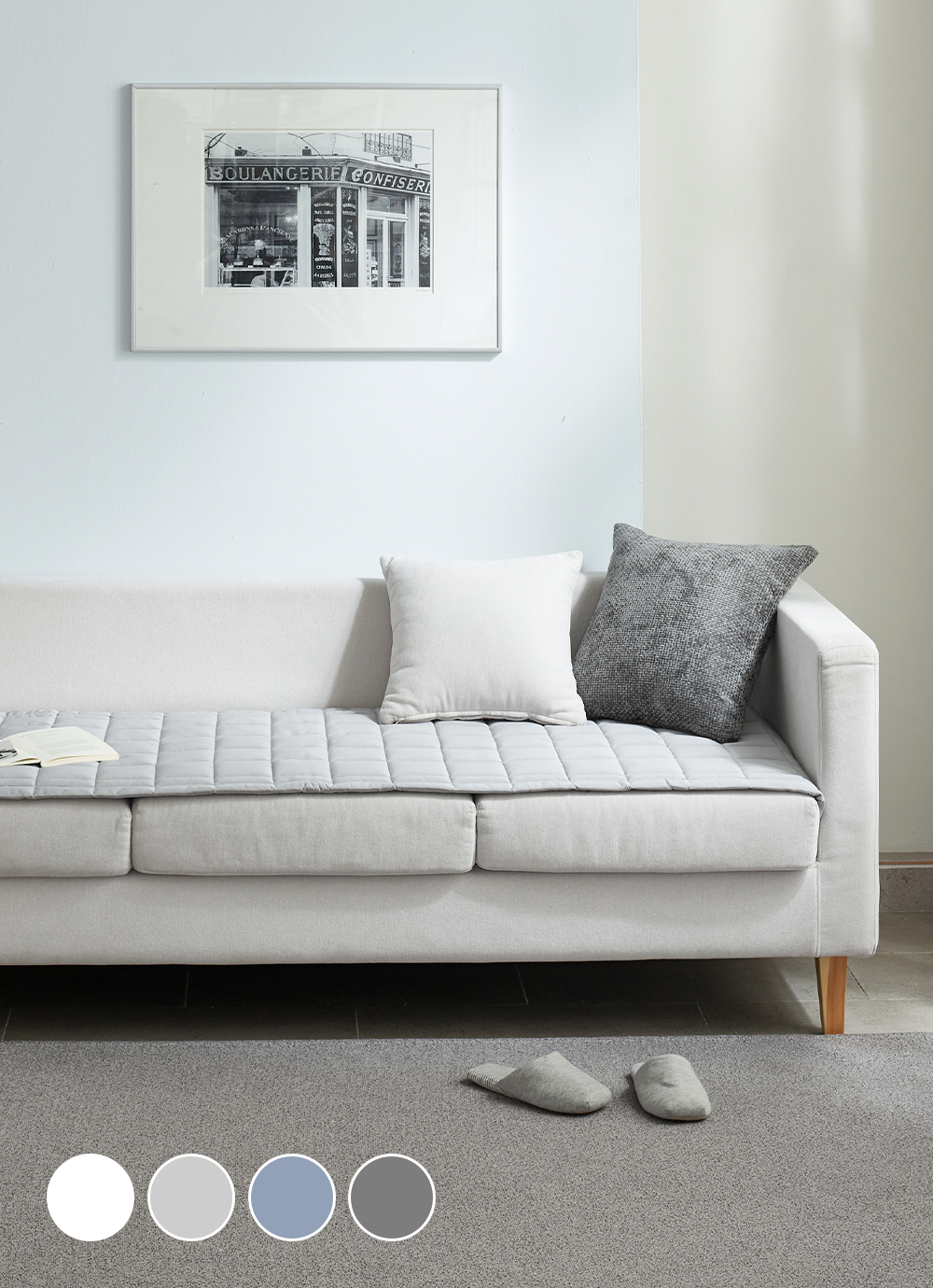 약간 연한 하늘색 섞인 회색이라 더 맘에 들어요~ 필터 씌운 것마냥 쇼파가 예뻐졌어요ㅎㅎ