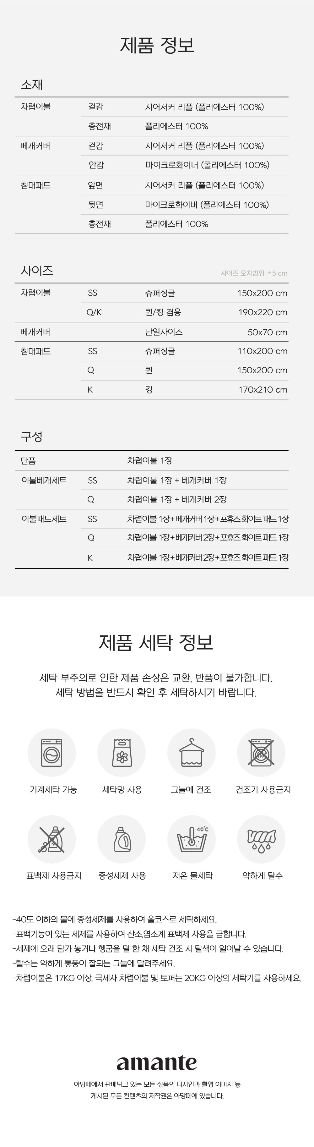 사이즈 및 구성 : Q 이불단품